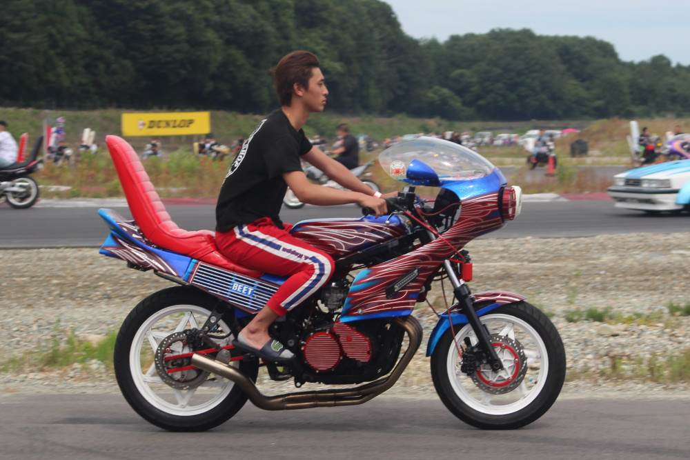 昭和後期の暴走族にとってCBX400Fは“バイブル”的存在。この赤×銀カラーにショートカウル、直管マフラー、旗立てまで完備された一台は、まさにリーダー格が乗るべき仕様。
