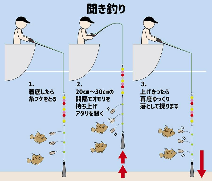 3.カワハギ釣りの釣り方には『聞き釣り』、『タタキ釣り』、『タルマセ釣り』、があります。様々な釣り方を試してカワハギの反応を探ります。
