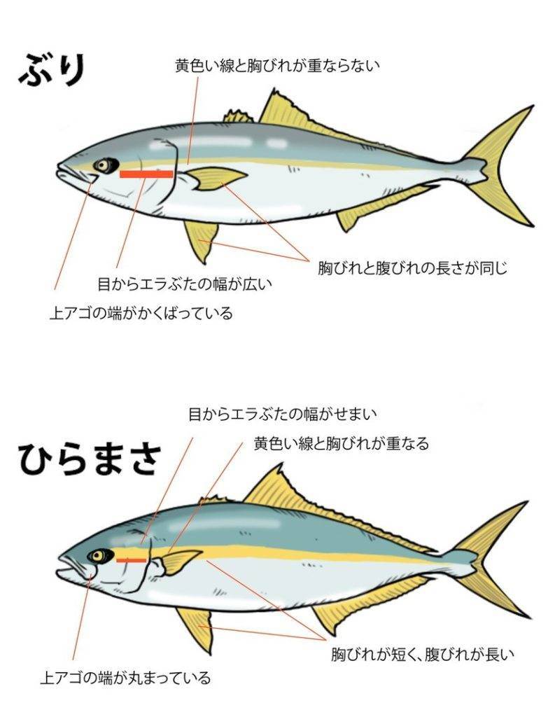 さらに、胸びれと体の中央にある黄色線の位置でも見分けられ、ブリは胸びれが黄色線の下にあるのに対し、ヒラマサは重なる。このようなポイントを覚えておけば、確実に見分けることができる。