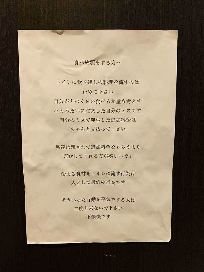 3.トイレに残した料理を流す客 店が貼った1枚の警告メッセージに同情の声