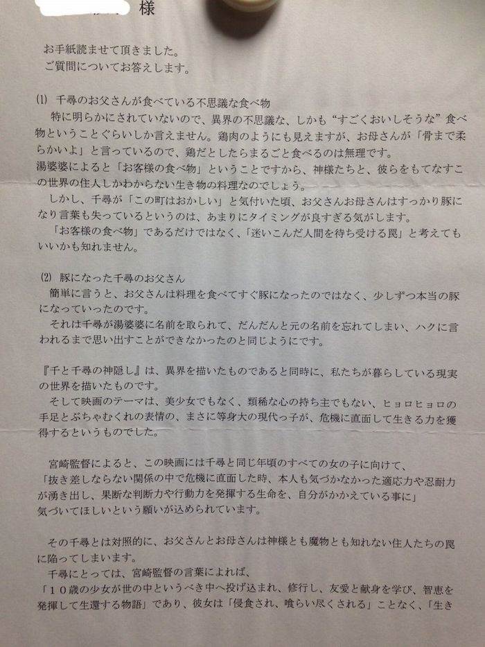 4.千と千尋の神隠し「お父さんが食べてる物と両親が豚になった事」を質問をしたらジブリが手紙をくれた