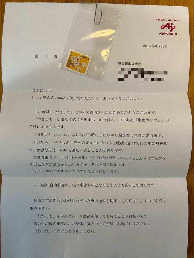 2.子供が塩について調べていて『やさしお』を舐めたら冷たく感じ手紙を出す→メーカーの返事が末尾まで美しい。