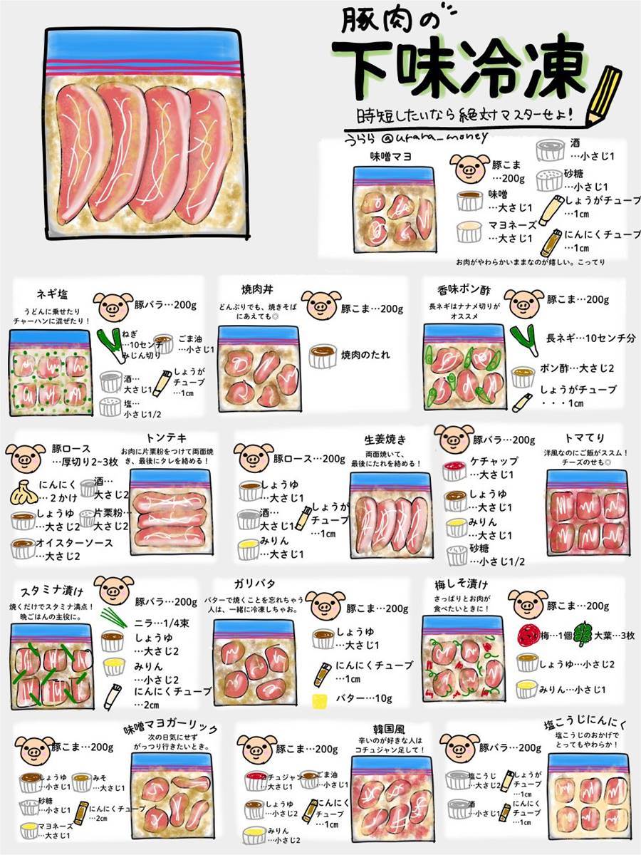 2.やらなきゃ損!節約のために豚肉の特大パック買った人は今すぐ下味冷凍して。疲れてもうムリ…って時もちゃちゃっと作れて15分以上は時短できる。