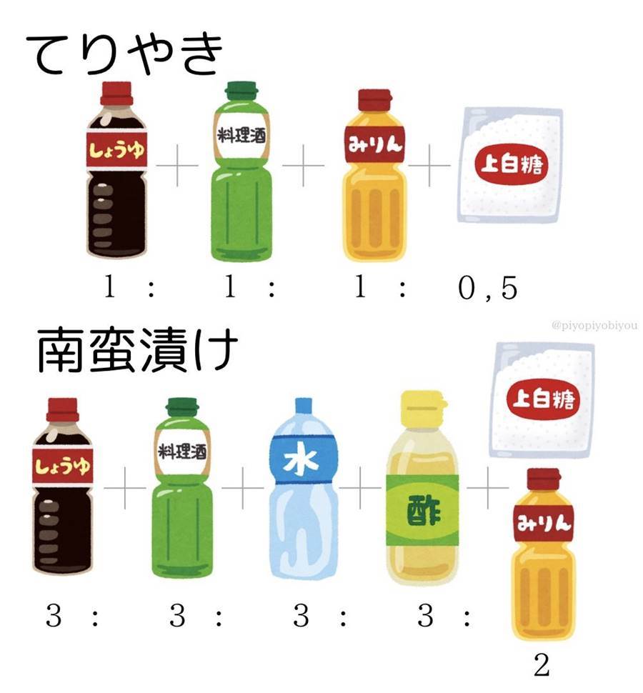 2.てりやきと南蛮漬けの調味料の使い方。