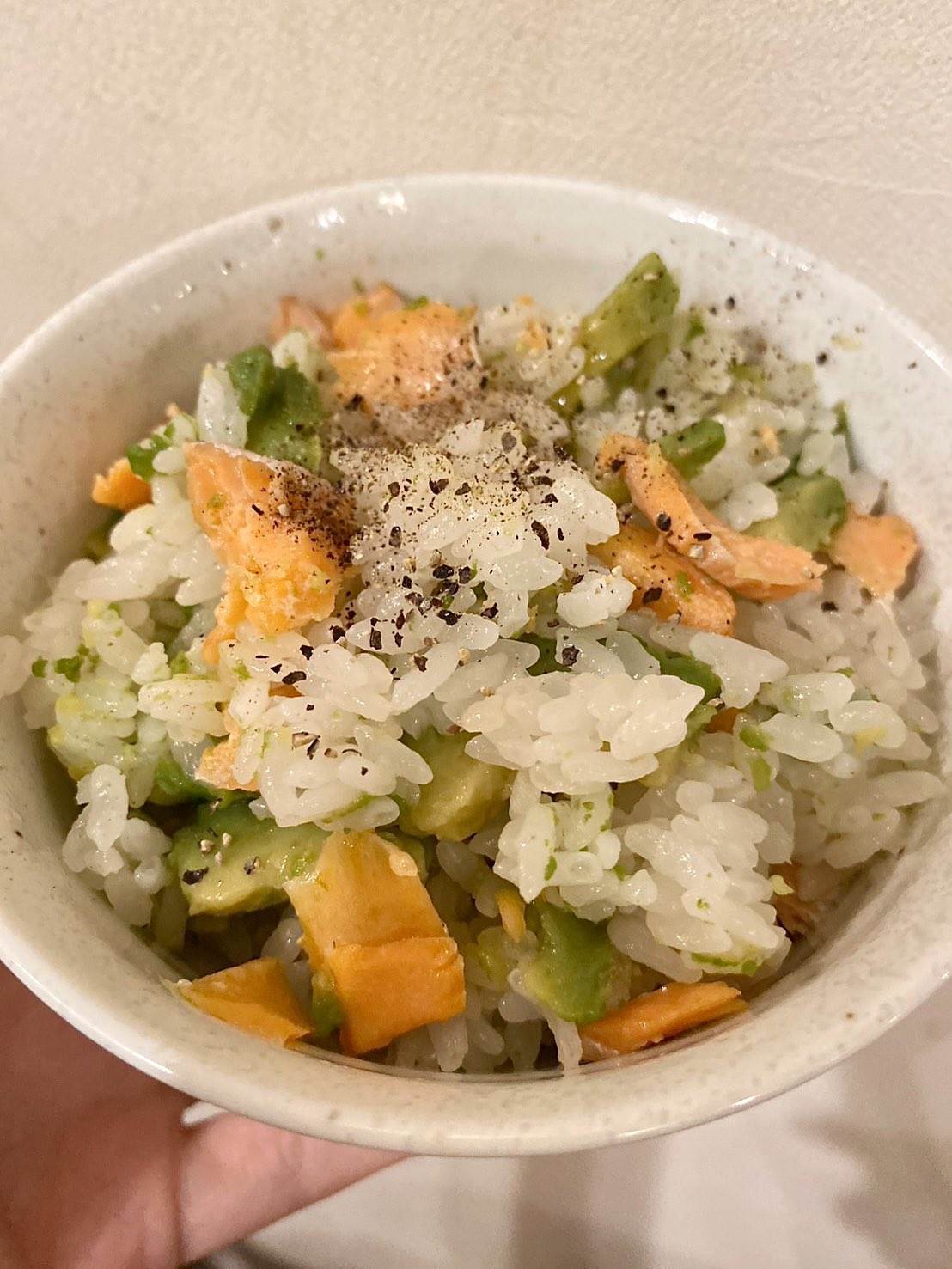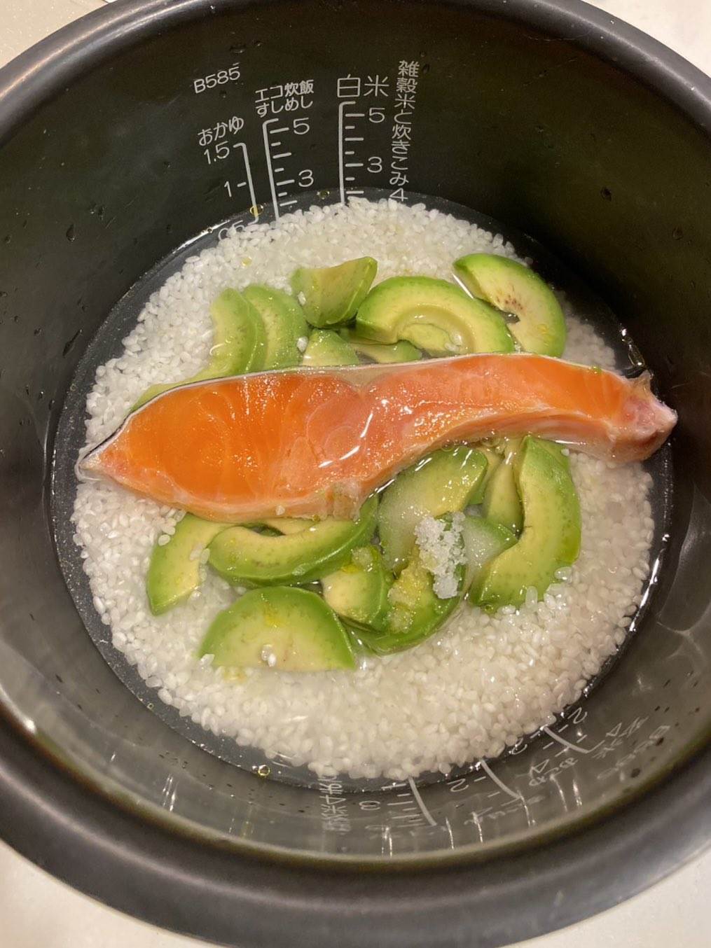 2.あまりの美味しさに感動してしまった鮭とアボカドの炊き込みご飯。米2合に鮭、アボカド1個、酒とレモン汁大さじ2、塩小さじ1、オリーブオイルひと回しして炊くだけ。黒胡椒たっぷり振って食べるのがオススメです。