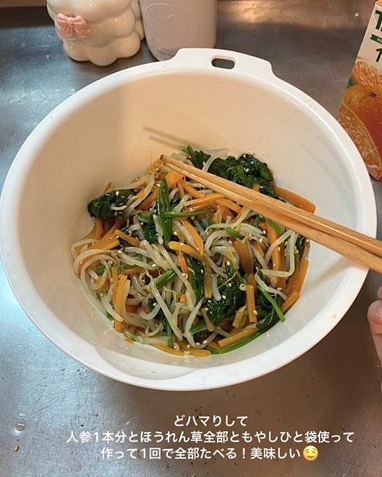 3.もやし1袋、人参1本、ほうれん草1袋レンチンして鶏ガラ小さじ1と塩小さじ1/2、醤油とゴマ油大さじ1あえてごまたっぷり混ぜたナムル、やみつきすぎて無限に食べてる