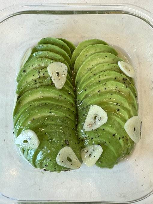 1.アボカドはゴマ油と生ニンニクに漬け込んで、塩、ブラックペッパーかけると旨すぎて飛べます