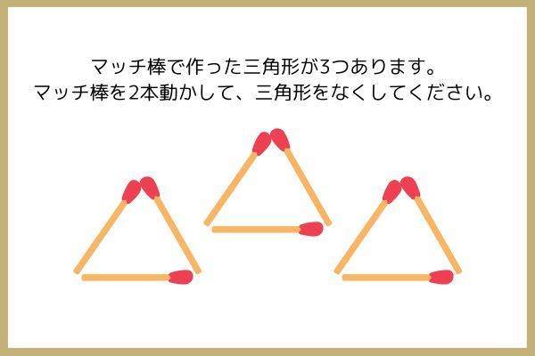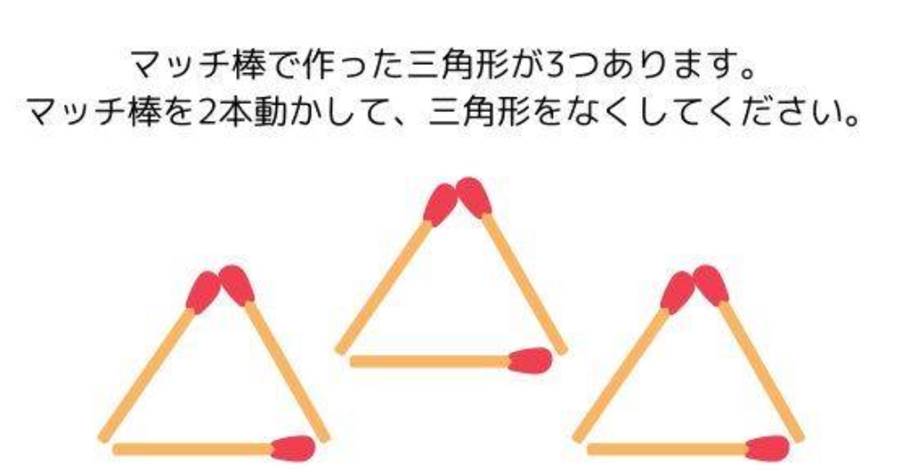 4.次の図のように、マッチ棒で作った三角形が3つあります。マッチ棒を2本だけ動かしてマッチ棒をなくしてください。