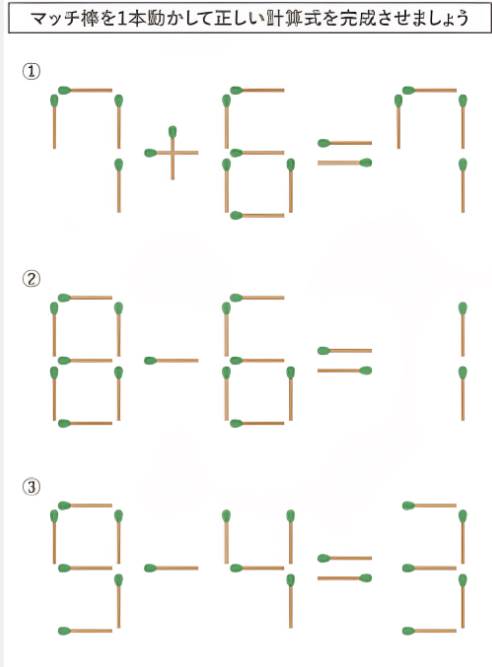 1.マッチ棒を1本動かして正しい計算式を完成させましょう