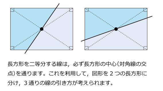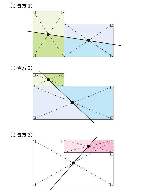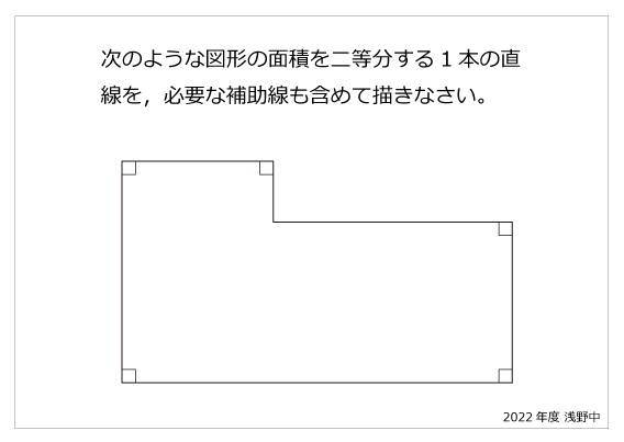 2.中学入試で出された恐ろしい問題 次のような図形の面積を二等分する1本の直線を,必要な補助線も含めて描きなさい。