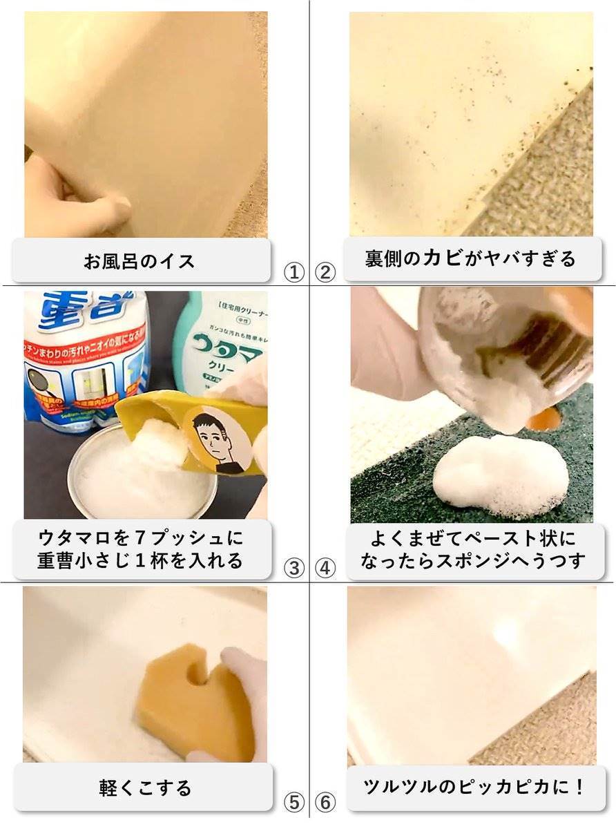 4.お風呂のイスをひっくり返したらカビとザラザラがヤバすぎて、自分もひっくり返った人に教えたい。ウタマロの効果で汚れが簡単に落ちるし、重曹の研磨作用で100倍ツルピカになる。