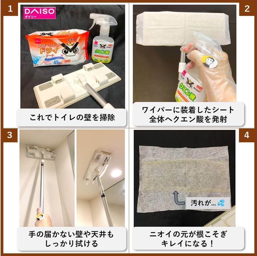 3.トイレの壁を見るたび「一度も掃除したことない…」ってモヤモヤしている人にはコチラ。クエン酸の消臭効果でスッキリ空間へ生まれ変わる。しかもこうやってワイパー使えば、手の届かない壁の隅っこや天井も拭けるから100倍気持ちいい。