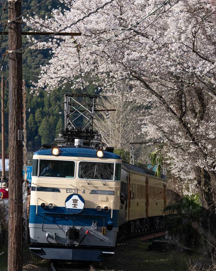 4.「富士」と桜 写真を見ると一瞬、 昭和40年代?と錯覚しそうになる 木造の電柱に かつて走っていた ブルートレインを思わせる 旧型機関車 この機関車は 本日お披露目された かつての電気機関車に塗られていた 「国鉄型」の塗装に復元された 大井川鐵道のE31形4号機 見た目はまるで かつてブルートレインを牽引した EF65P形(500番代)のよう 車体の短さから 鉄道車両のおもちゃ 「トレインショーティー」を思わせる