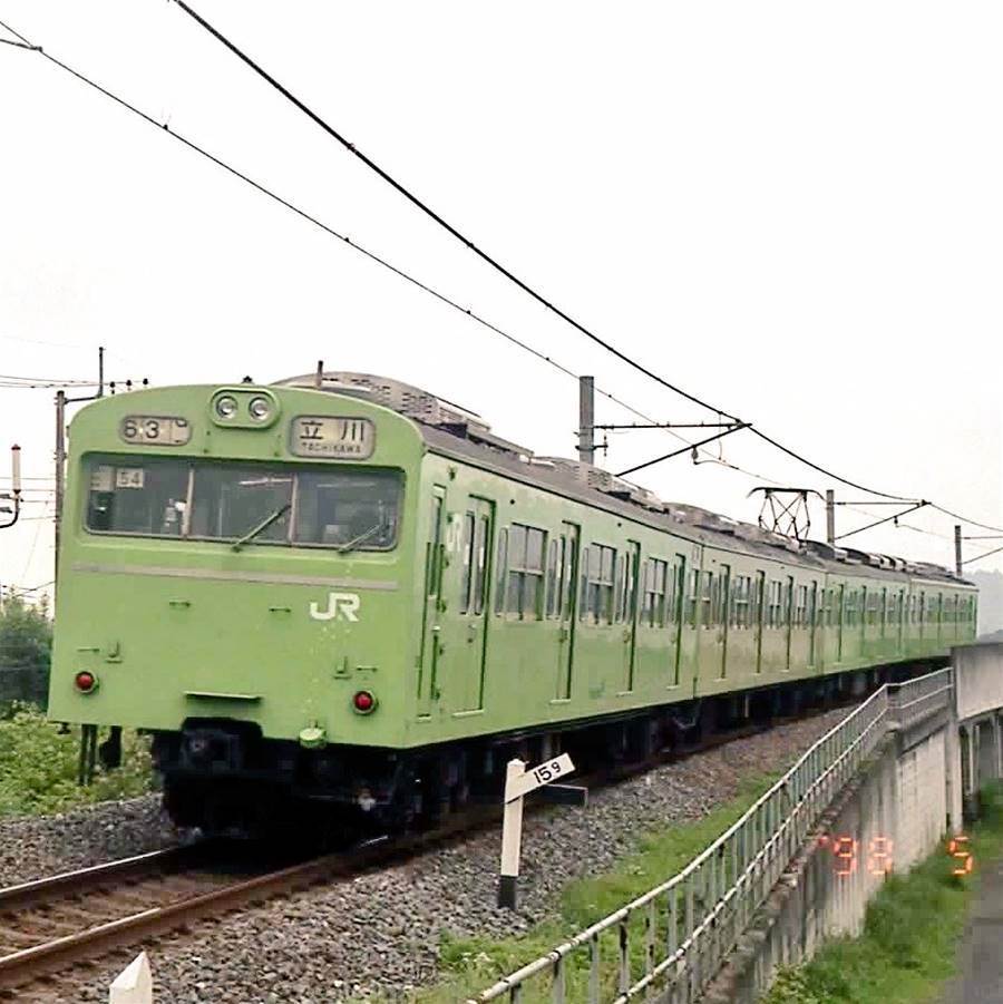 3.四半世紀前の八高線を走る ウグイス色の103系電車 前面にテール掛け用フックがあるので 旧形国電からのアコモ車かな? 15‰の勾配を登り西武池袋線を跨ぎ 金子峠を越えて行きます 八高線 東飯能〜金子にて