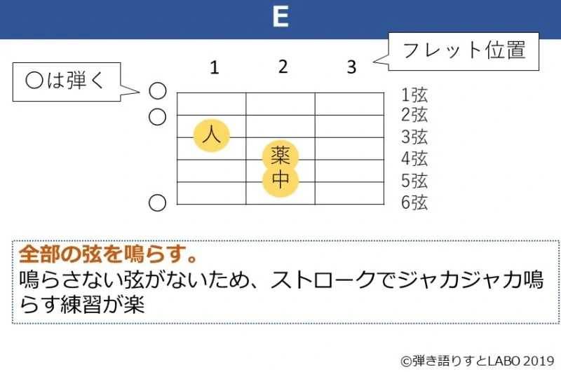 4.Eは6弦から1弦まですべての弦を鳴らしてOKなので、ジャカジャカやるには最適なコードです。