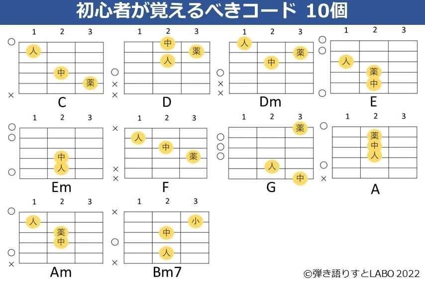 ギター初心者の方に最初に覚えてもらいたいコードはズバリ10個です。この10個のコードを覚えれば、簡単アレンジした楽曲を演奏できるようになります。最初はなかなか左指が付いてこないので、指が押さえ方を覚えるまで毎日少しずつ練習していきましょう。それでは、10個のコードを1つずつ解説していきます。